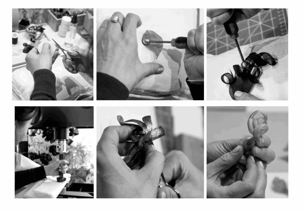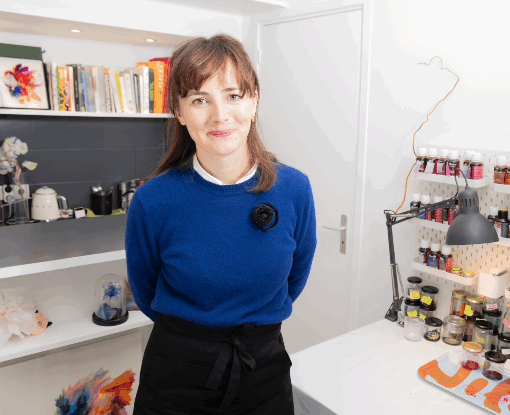 Désormais installée dans un petit atelier à Paris, je dessine, je découpe, je teins, je forme et j’assemble les pétales des fleurs que j’invente.